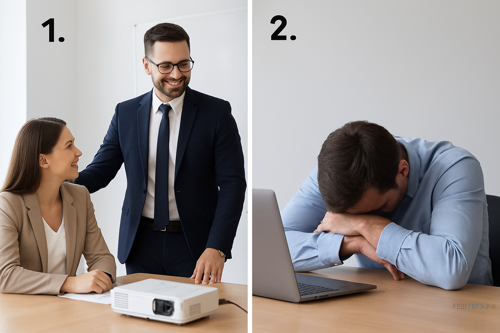 Both pictures show people at work who have probably finished doing some complicated projects. But there is a big difference, too. People in the first picture look very happy and pleased, whereas the man in picture two looks frustrated.