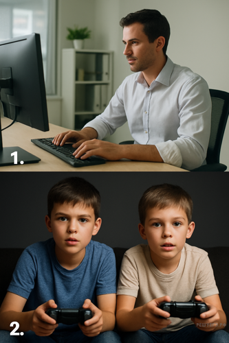 The first photo shows us a man in the office. He is looking at the screen and holding his hands like he is typing something. He might be working. In the second picture we can see two kids, playing video game. They are holding the controllers in their hands and there should be a TV standing in front of them, but it isn’t seen in the photo. They look very focused and excited. Perhaps, they are playing some combat game fighting against each other.