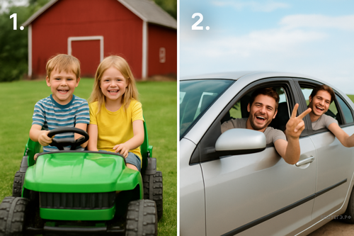 Both of the pictures are related to cars and driving. Both of the shots were made outdoor, during the summer season. In both of them there are some people. But there is a difference too: firstly, on the left we see kids meanwhile on the right there are adults. Secondly, on the left the characters are driving a toy car, while on the right the car is real.